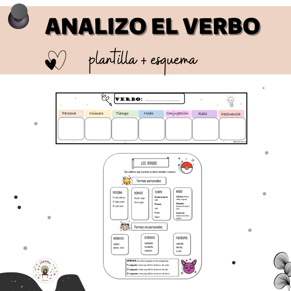 Un pdf con una plantilla para analizar el verbo al completo y une esquema sencillo y visual sobre los verbos.